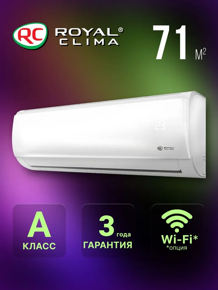 Кондиционер Royal Clima Triumph Lite RC-TWL70HN 70 кв.м Создан для вашего комфорта! Royal Clima Triumph Lite RC-TWL70HN – это мощная бытовая сплит-система, охватывающая площадь до 70 кв.м. Обеспечивает эффективное кондиционирование, вентиляцию, осушение и обогрев вашего помещения. Ключевые особенности: Мощность: 70 кв.м Энергоэффективность: Класс А Технологии: Японские технологии Режимы: Кондиционирование, вентиляция, осушение, обогрев Умные функции: Умное оттаивание, настраиваемый таймер, автоматический перезапуск, самодиагностика, локальный микроклимат, функция iFeel. Комфорт: Режим комфортного сна, защита от простуды. Защита: Антикоррозийное покрытие Golden Fin, индикация утечки хладагента, защитные накладки на вентили. Управление: Пульт ДУ в комплекте, голосовое управление Яндекс Алиса. Дополнительно: Зимний комплект -40 (опция), противопылевой фильтр высокой плотности, шумоизоляция компрессора, защита от блокировки кнопок пульта. Серия Triumph Lite – это надежные и современные сплит-системы от Royal Clima, разработанные для вашего комфорта и безопасности.